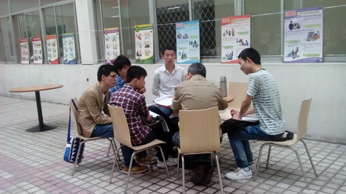 學生在公司附近準備求職資料